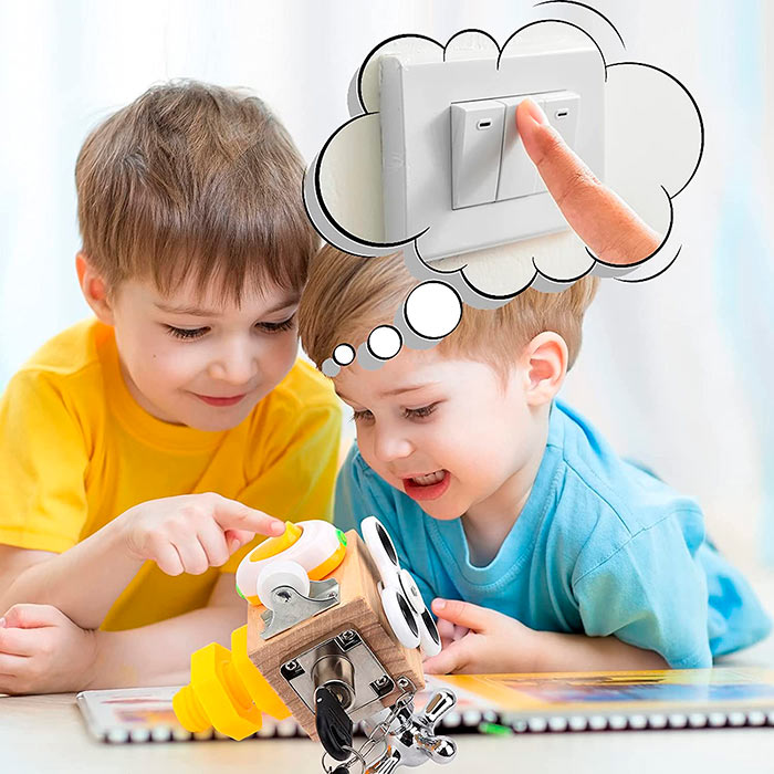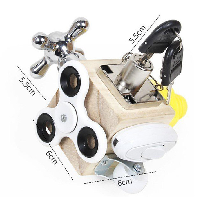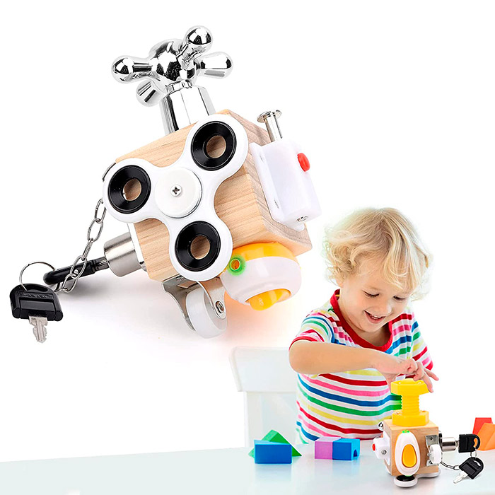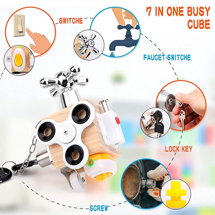 Образователната играчка за деца BusyCube предлага 7 различни дейности – спинър, ключалка с 2 ключа, резе, колело, ключ, винт и гайка! Играчката е проектирана така, че детето да е максимално активно, което ефективно насърчава умственото развитие, мотивацията, логическото мислене, фината моторика, креативността и постоянството!