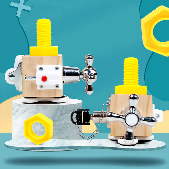 - Много дейности – завъртане, ключалка с 2 ключа, резе, колело, ключ, винт и гайка