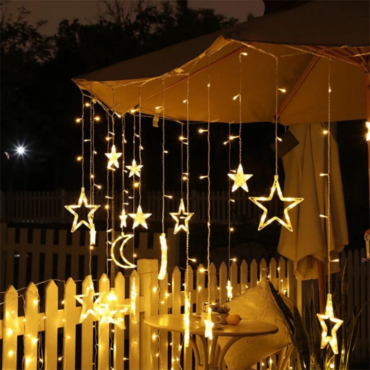 | В пакета: | 1x комплект декоративни светлини със звезди и луна мотив с конектор за контакт (12 декоративни звезди и луни) |
